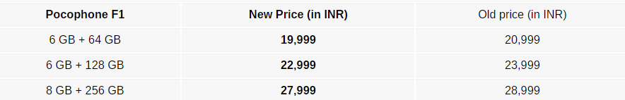 and now they are looking forward to celebrate the price cut of Rs 1,000 for all variants of Poco F1. So the new prices are as follows The Poco F1 will still be sold by Flipkart and Mi.com with new prices, it features a 6.18 inch notch display which is powered by a premium Snapdragon 845 SoC. There is 4000mAh battery with Quick charge 3.0 support. It has LiquidCool Technology and AI Dual Camera. Get further specifications details of Poco F1 here.